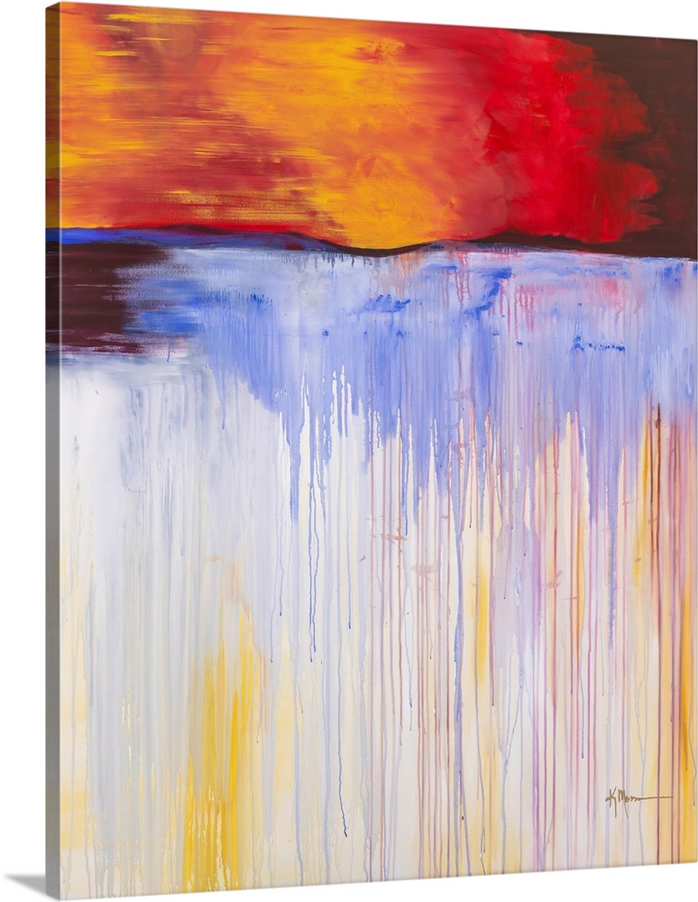 <p>Vibrant abstract painting featuring a fiery red and yellow sky over a dark horizon, with cool blue and white paint dripping downwards like a waterfall against a light background. Dynamic and serene.</p>