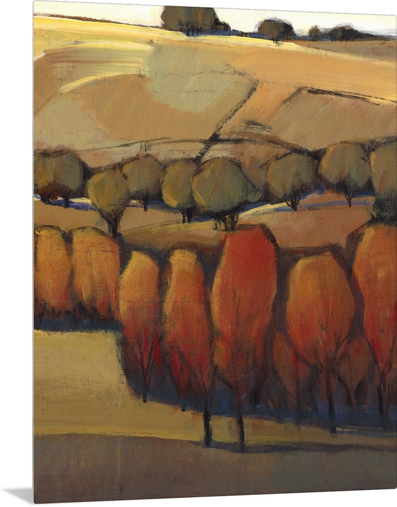 <p>Contemporary painting in warm tones of a rural landscape in autumn.</p>
