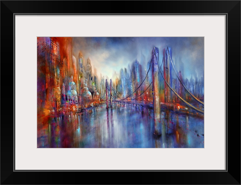 <p>Abstractly painted cityscape in bright colors and structures: on the way on a suspension bridge, in the background a large, lively city with the silhouette of skyscrapers in red and blue. Reflection in the water.</p>