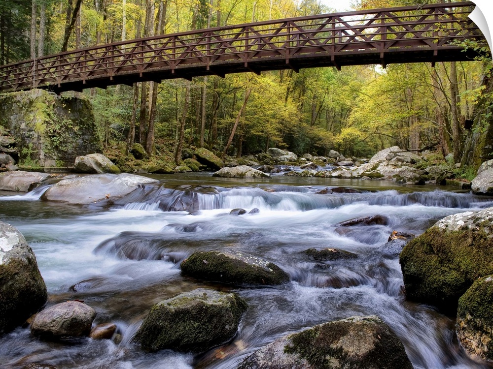 <p>Photograph of a rushing river flowing under a bridge in a dense forest.</p>