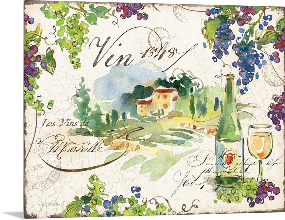 <p>Painting of an Italian vineyard, purple and green grapes, a bottle of wine, and a glass of white wine on cream antique cracked background with brown Italian text.</p>