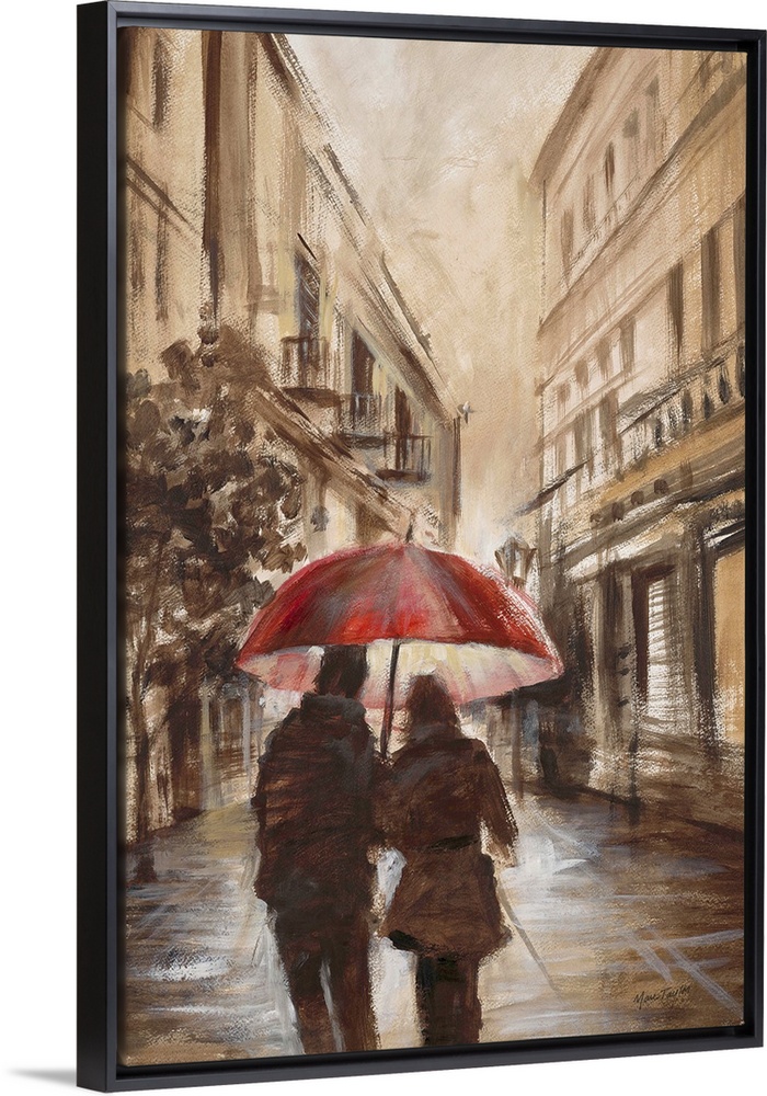 <p>Contemporary painting of a walking side by side under a red umbrella.</p>