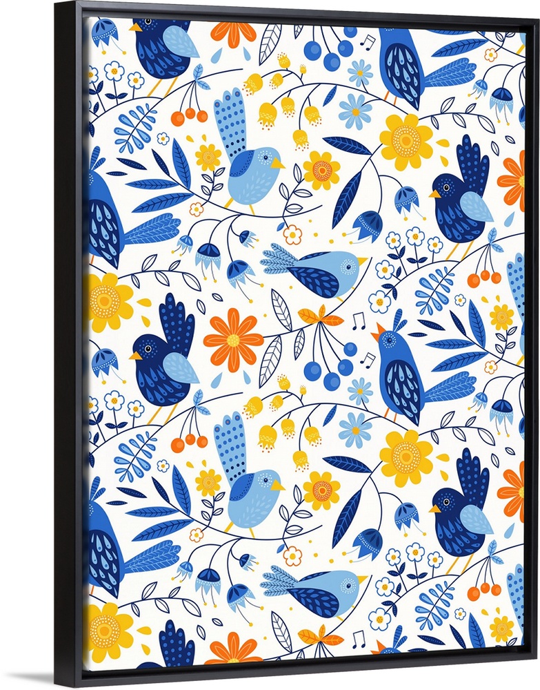 <p>Colorful contemporary patterned artwork incorporating birds and flowers.</p>