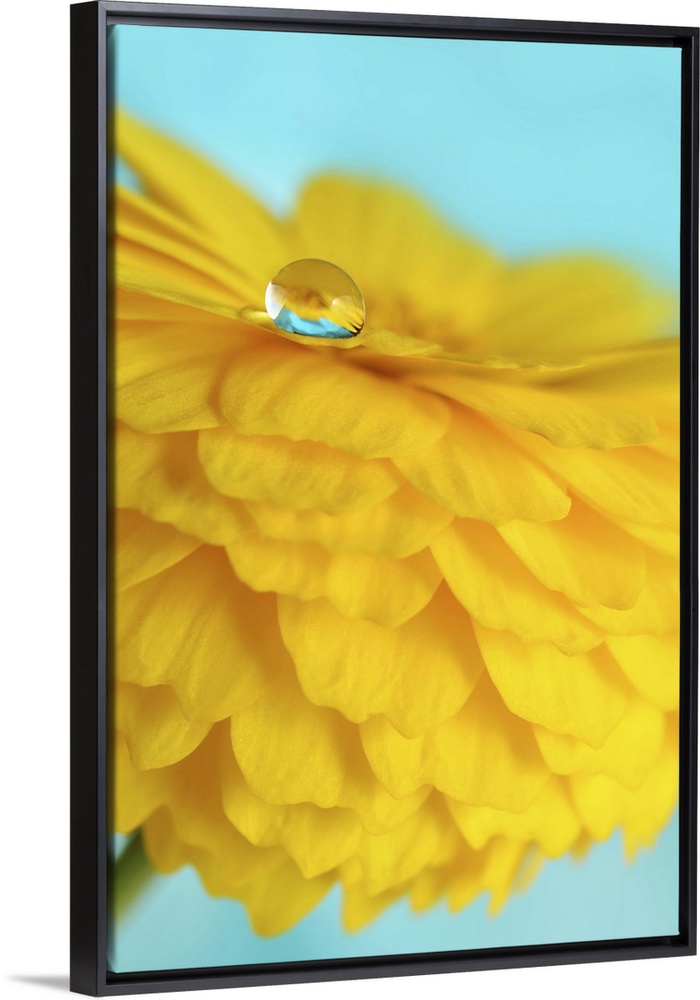 <p>A macro photograph of a water droplet sitting on the edge of a yellow flower petal.</p>