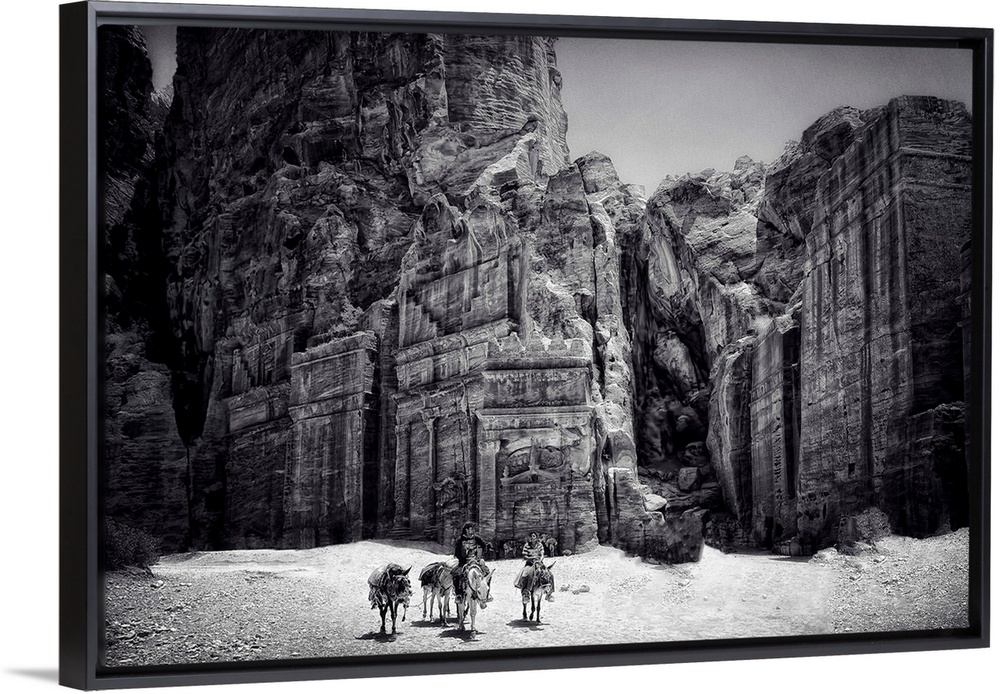 <p>People with donkeys in front of the temple at Petra, Jordan, in the desert.</p>