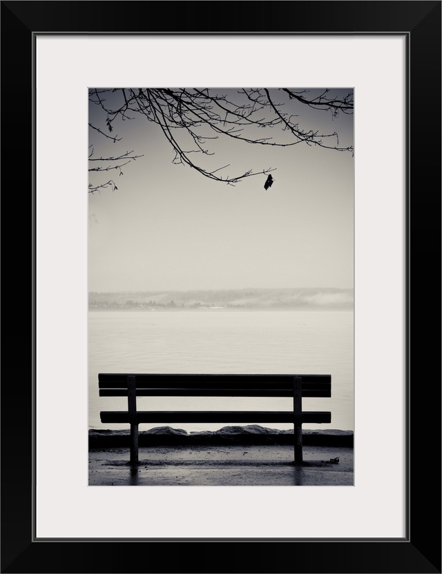 <p>An emply bench along an ocean walk with one leaf on tree branches hanging down.</p>