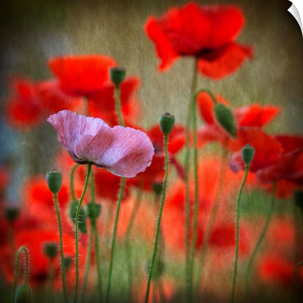 <p>Close-up photograph of a pink flower among red flowers in a field.</p>
