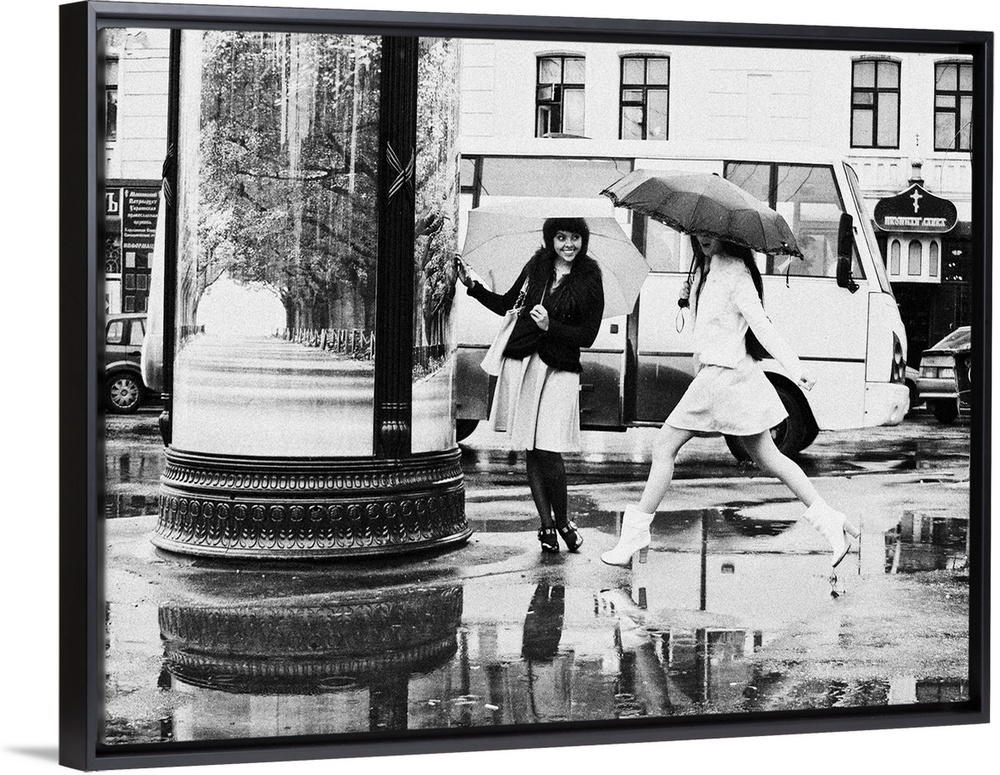 <p>Two young women with umbrellas avoid puddles in the street.</p>