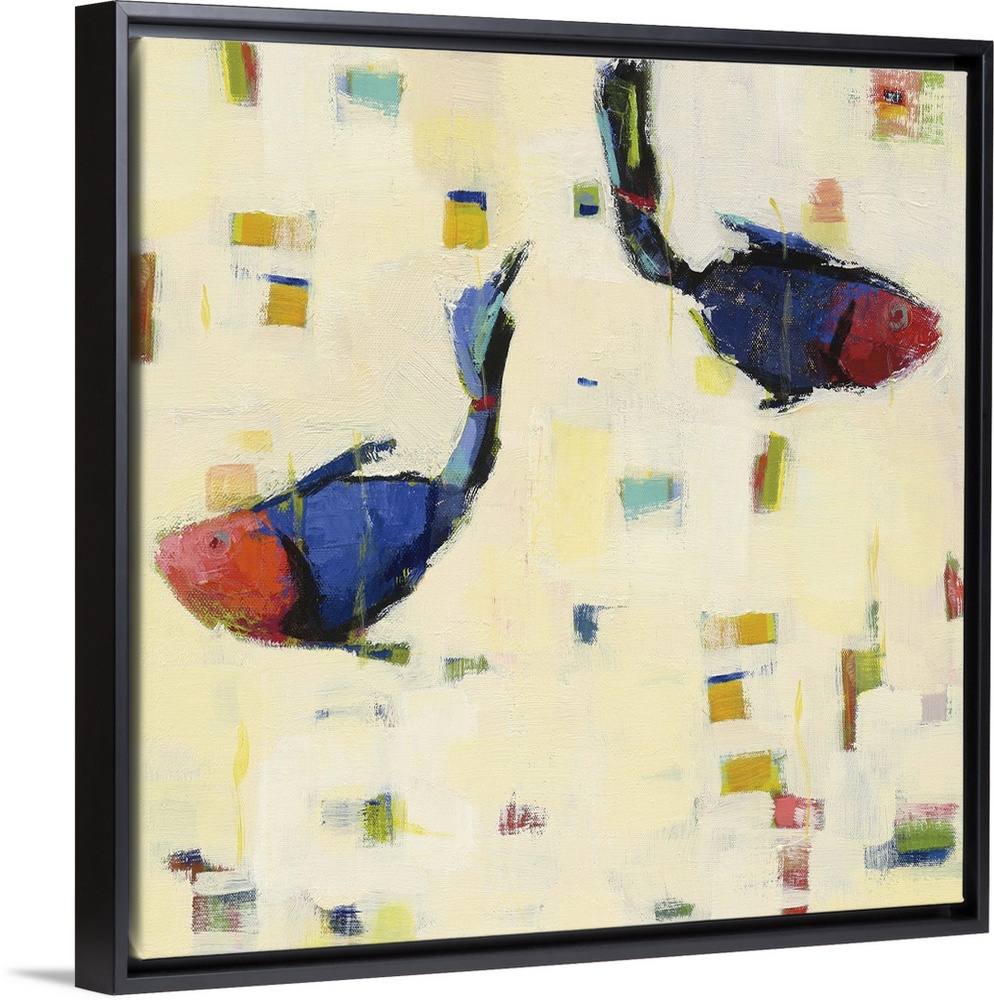 <p>Contemporary abstract painting of two blue and red fish swimming opposite ways with colorful squares spread sperratically around the background.</p>