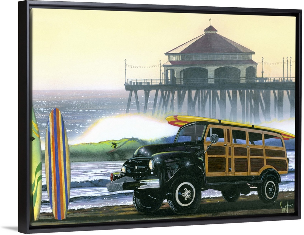 His clearly recognizable images of Hawaii beaches and flowers go alongside iconic surfing art featuring woodie cars, flip flops, surfboards and whimsical dogs.