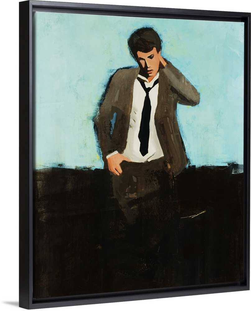 <p>Portrait painting of a man in a suit and tie, standing with one hand on hip, the other reaching to the back of his neck as he gazes downward into the deep black foreground.</p>