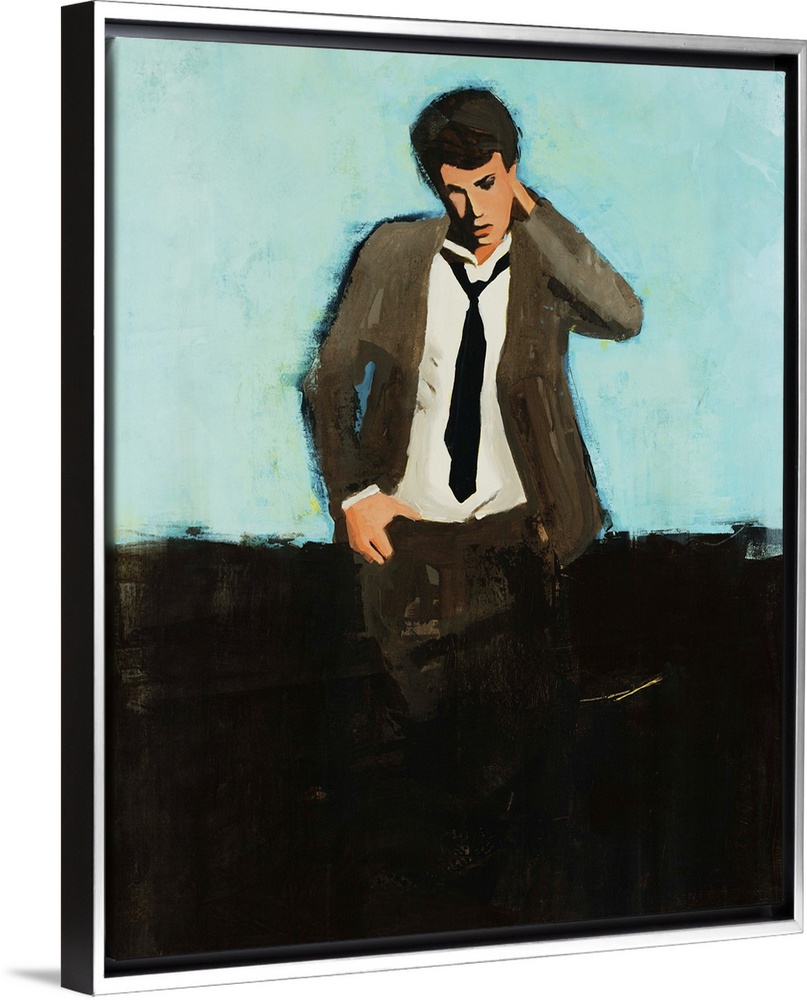 <p>Portrait painting of a man in a suit and tie, standing with one hand on hip, the other reaching to the back of his neck as he gazes downward into the deep black foreground.</p>