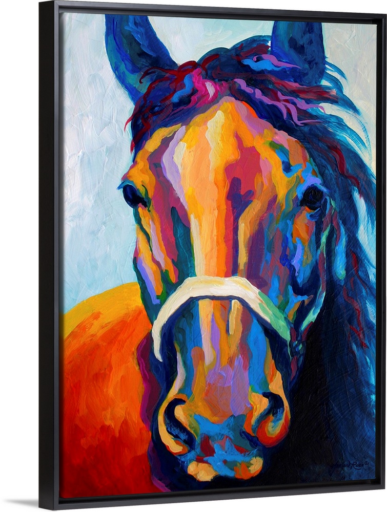 <p>Contemporary art uses warm and cool colors to portray an up close image of a haltered horse's head whose mane is softly blowing in the wind.</p>
