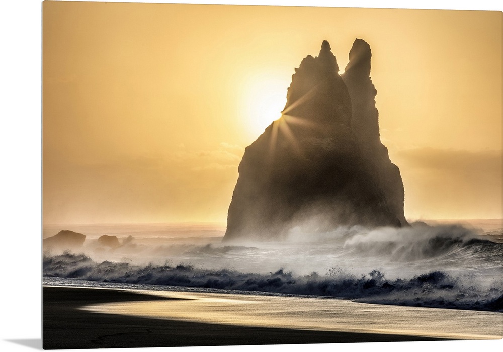 <p>One of the Reynisdrangar rock stacks at sunrise, from Reynisfjara black sand beach, near Vik y Myrdal, South Iceland.</p>