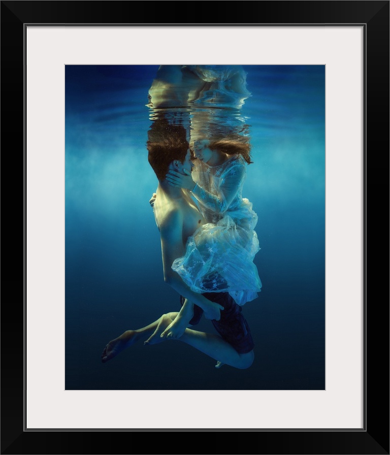 <p>Underwater portrait of a man and woman holding each other, about to kiss.</p>
