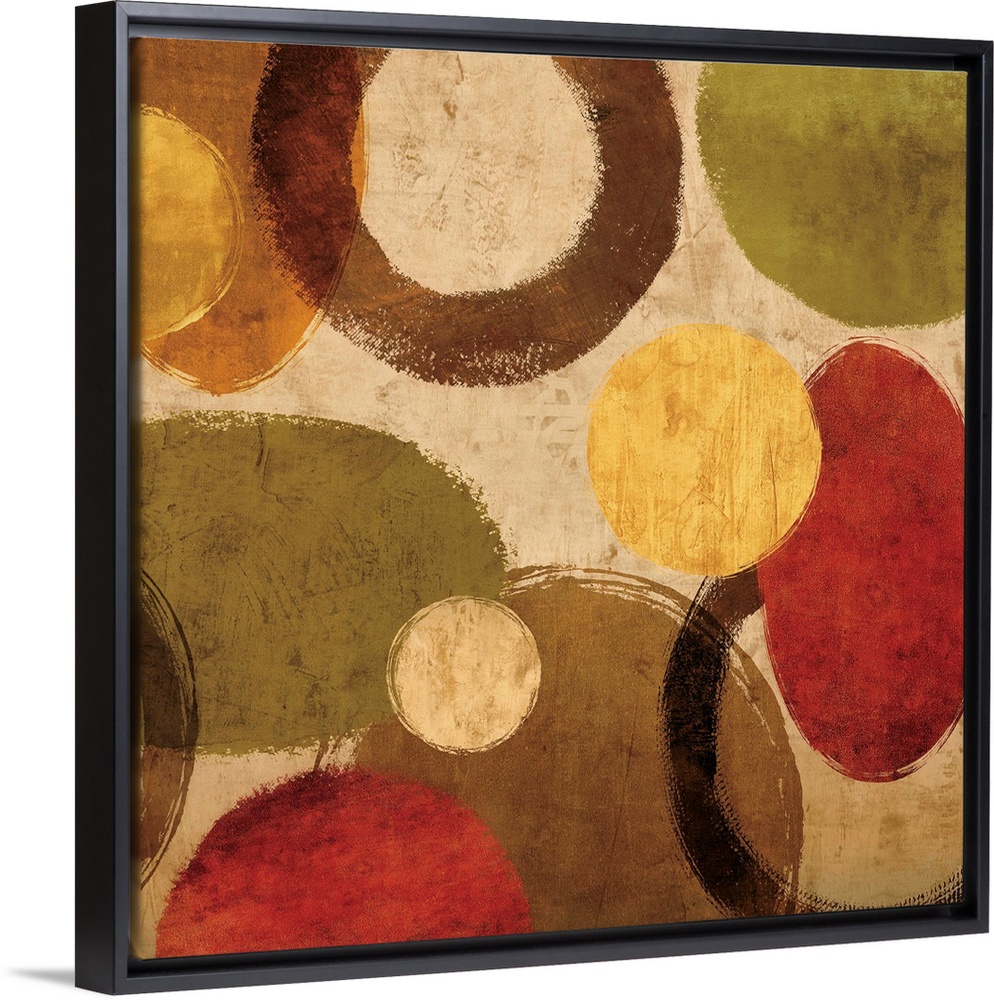 <p>Square abstract art created with red, green, gold, and brown circular shapes on a neutral colored background.</p>