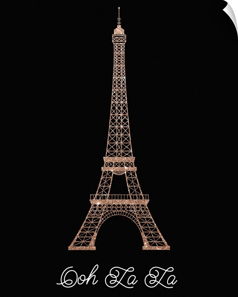 <p>Sparkly rose gold Eiffel Tower illustration on a solid black background with the phrase "Ooh La La" written underneath in white.</p>