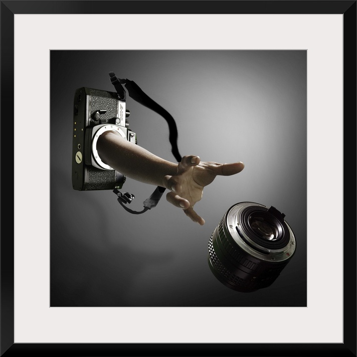 <p>Conceptual image of an arm reaching out of a film camera towards a falling lens.</p>