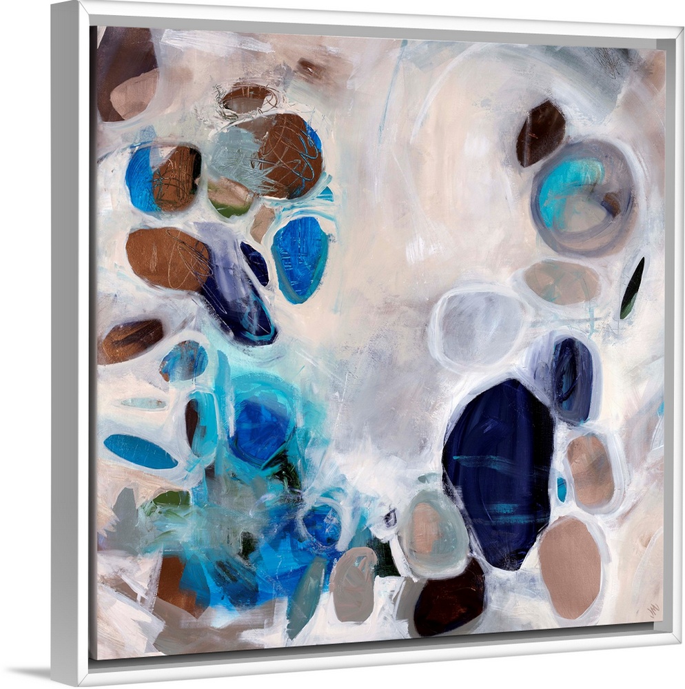 <p>Contemporary abstract painting of stone-like shapes in blues and browns over a neutral background.</p>