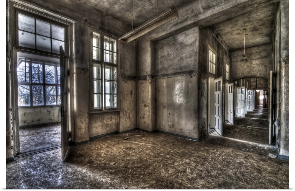 <p>Abandoned lunatic asylum north of Berlin, Germany. Empty room with corridor.</p>
