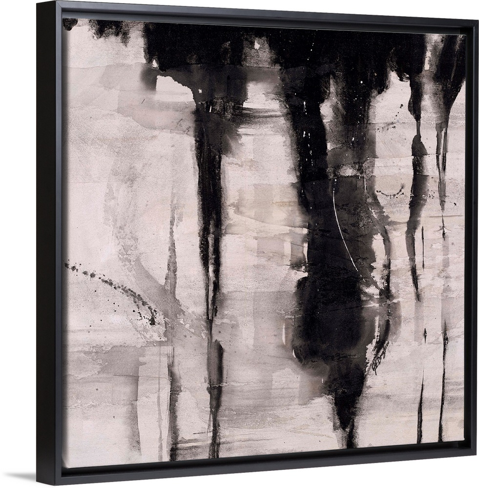 <p>Abstract painting using black paint dripping down from top of image, against a gray toned background.</p>