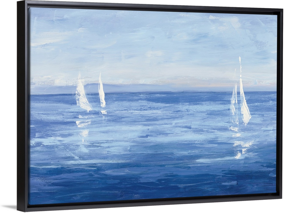 <p>Contemporary painting of white sails from sailboats casting reflections on the calm sea.</p>