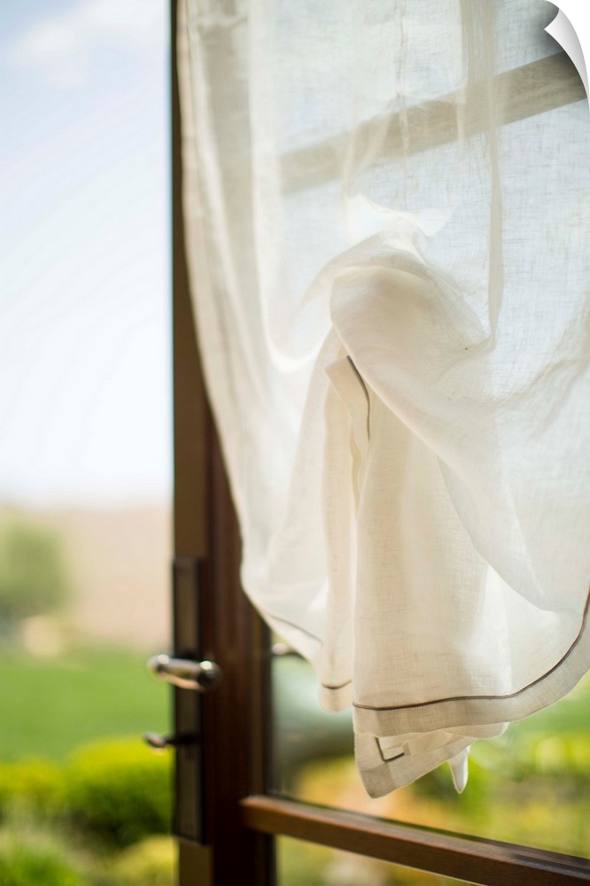 <p>An open window with a white curtain.</p>