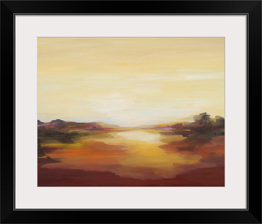 <p>A contemporary abstract painting of a red landscape under a pale yellow sky.</p>