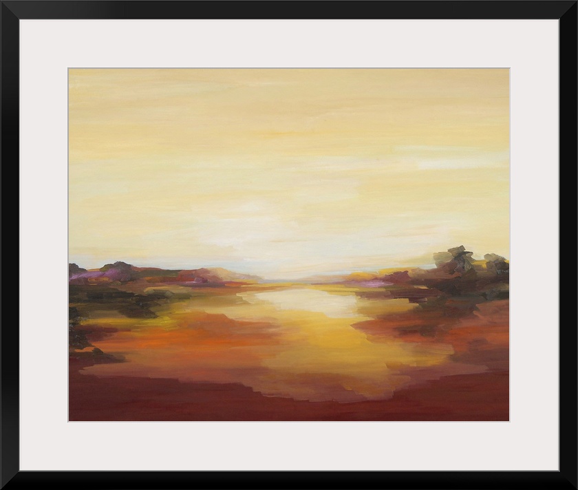 <p>A contemporary abstract painting of a red landscape under a pale yellow sky.</p>