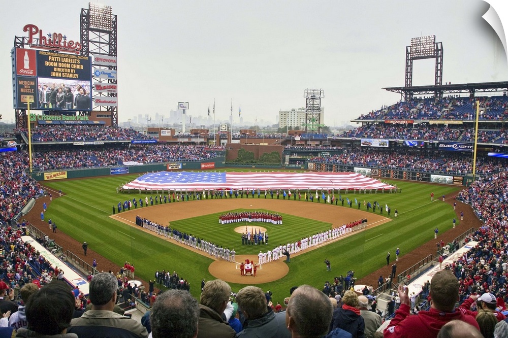 <p>Opening Day Ceremonies featuring gigantic American Flag in Centerfield on March 31, 2008, Citizen Bank Park where 44,553 attend as the Washington Nationals defeat the Philadelphia Phillies 11 to 6.</p>
