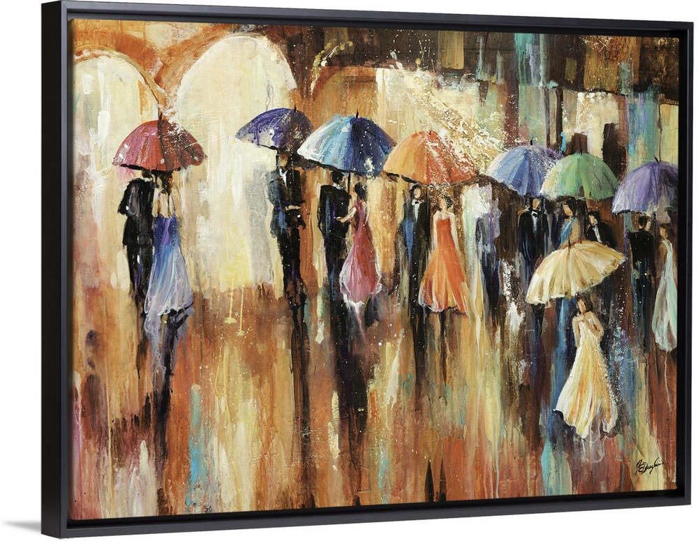 <p>Big painting of men and women under umbrellas going to a show as it rains.</p>
