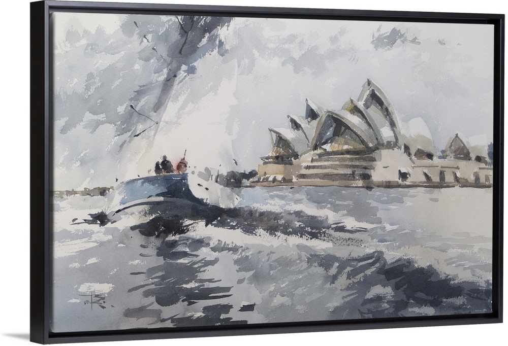 <p>This contemporary artwork uses moody blues and rustling watercolor brush strokes to create a yacht passing in front the Sydney Opera House.</p>