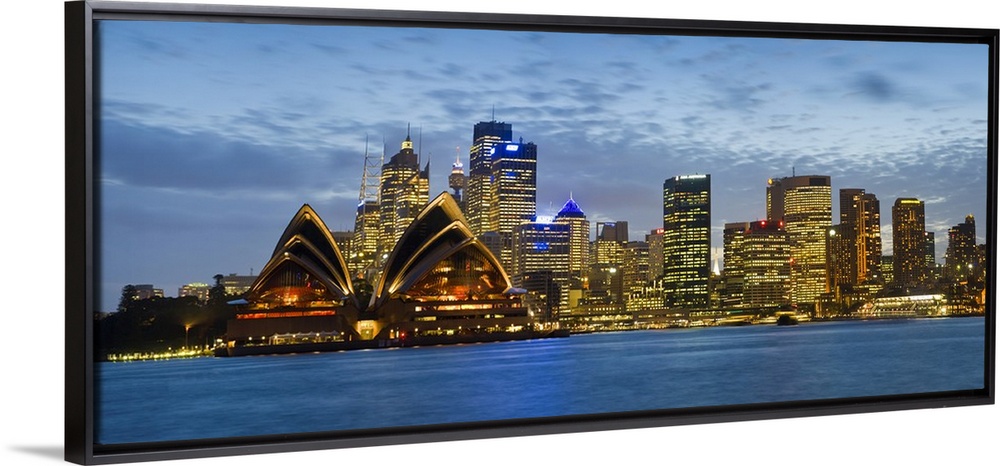 <p>Panoramic photograph taken at nighttime displays the brightly lit skyline and surrounding structures in a busy city within the sixth largest country in the world found between the Indian and Pacific Oceans. Sitting on the edge of the cove in this picture, a famous multi-venue performing arts center can be seen in front of the skyscrapers in the background.</p>