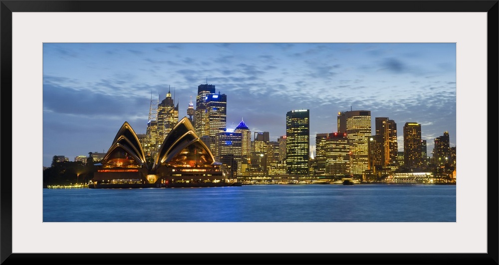 <p>Panoramic photograph taken at nighttime displays the brightly lit skyline and surrounding structures in a busy city within the sixth largest country in the world found between the Indian and Pacific Oceans. Sitting on the edge of the cove in this picture, a famous multi-venue performing arts center can be seen in front of the skyscrapers in the background.</p>