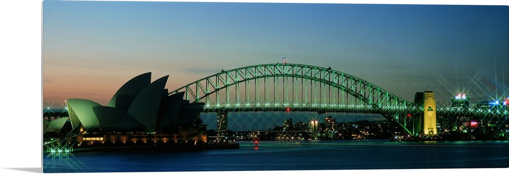 <p>Long horizontal canvas of the Opera House in Sydney lit up at dusk with a bridge running behind it.</p>