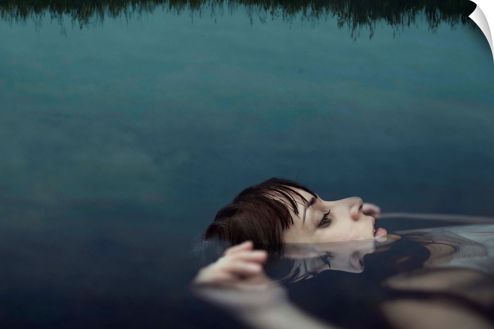 <p>A portrait of a woman wearing a white dress and floating in water with her face above the surface.</p>