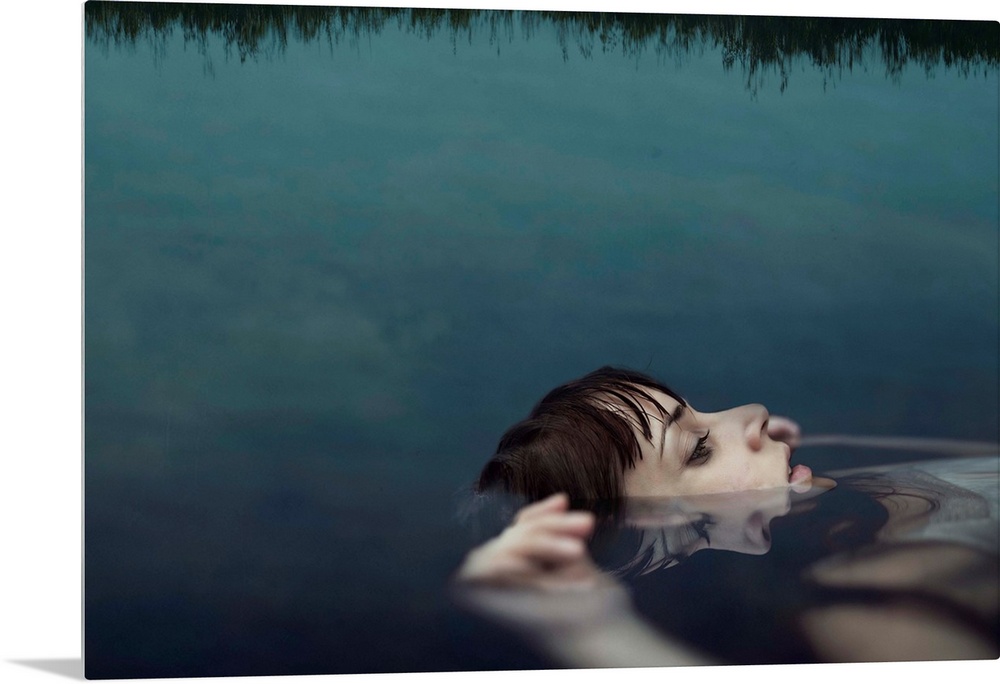 <p>A portrait of a woman wearing a white dress and floating in water with her face above the surface.</p>
