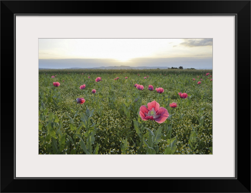 <p>Opium Poppies (Papaver somniferum) in field at Sunrise, Summer, Germerode, Hoher Meissner, Werra Meissner District, Hesse, Germany</p>