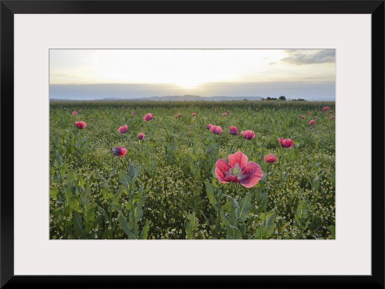 <p>Opium Poppies (Papaver somniferum) in field at Sunrise, Summer, Germerode, Hoher Meissner, Werra Meissner District, Hesse, Germany</p>
