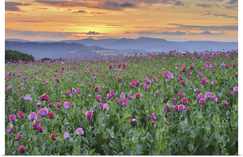 <p>Opium Poppy Field (Papaver somniferum) at Sunrise, Summer, Germerode, Hoher Meissner, Werra Meissner District, Hesse, Germany</p>