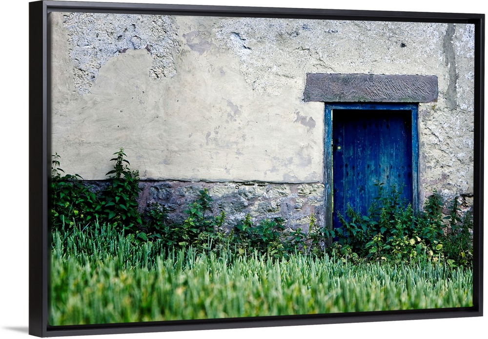 <p>Big, landscape wall picture of a blue door surrounded by a grey cement wall. Tall green grasses softly focused in the foreground.</p>