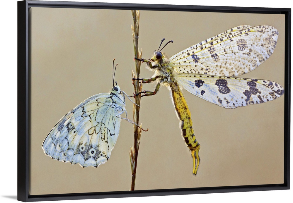 <p>A large dragonfly and a butterfly on opposite sides of a stem.</p>