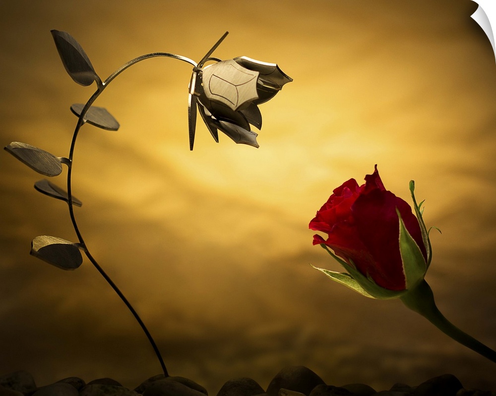 <p>Conceptual photo of a real rose and one made out of metal.</p>