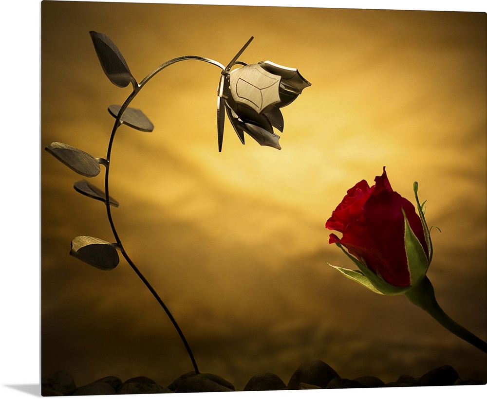 <p>Conceptual photo of a real rose and one made out of metal.</p>
