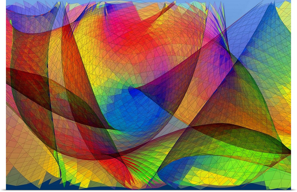<p>Optical pattern. Computer model of patterns formed by bending a coloured transparent sheet. The flat structure is distorted, as seen by the distortion of the gridlines. Viewing the distortion from this angle shows areas of overlap (darker) and actual fold lines. The colours have also been modified to reflect the distortion of the sheet. This pattern is an example of caustics, the patterns arising when overlap is observed. This model was created as an artwork by Professor Eric Heller.</p>