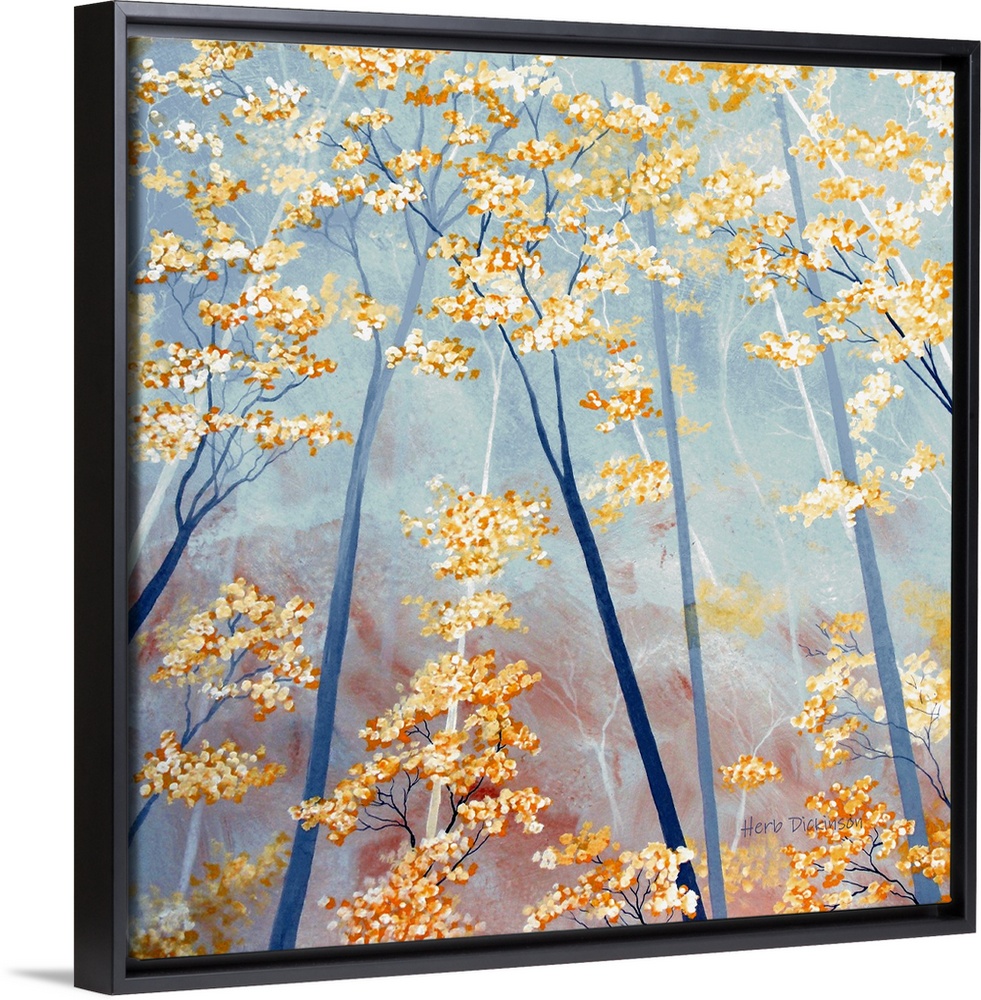 <p>Square painting of orange tree tops with tree trunks made in shades of blue.</p>