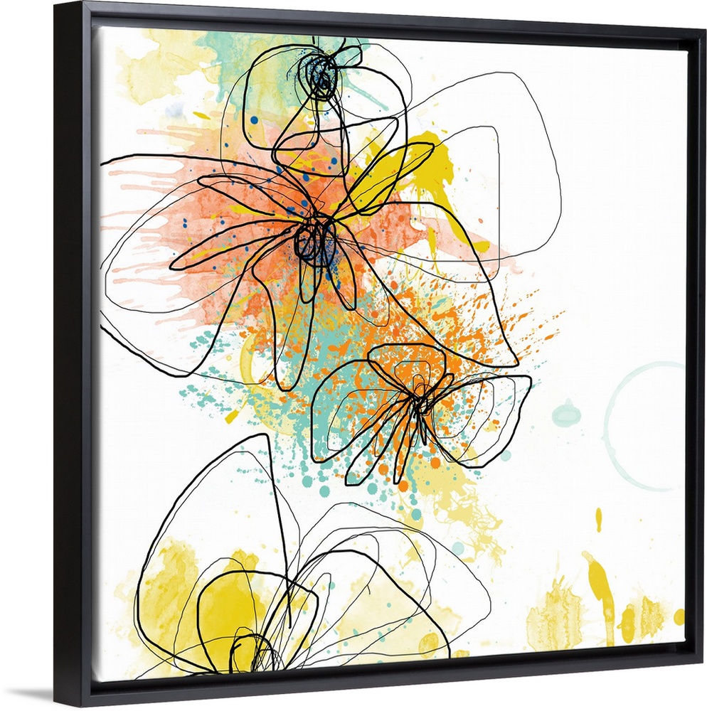 <p>Large contemporary art shows an illustration of a few outlined flowers against a backdrop interspersed with splashes of bright colors.</p>
