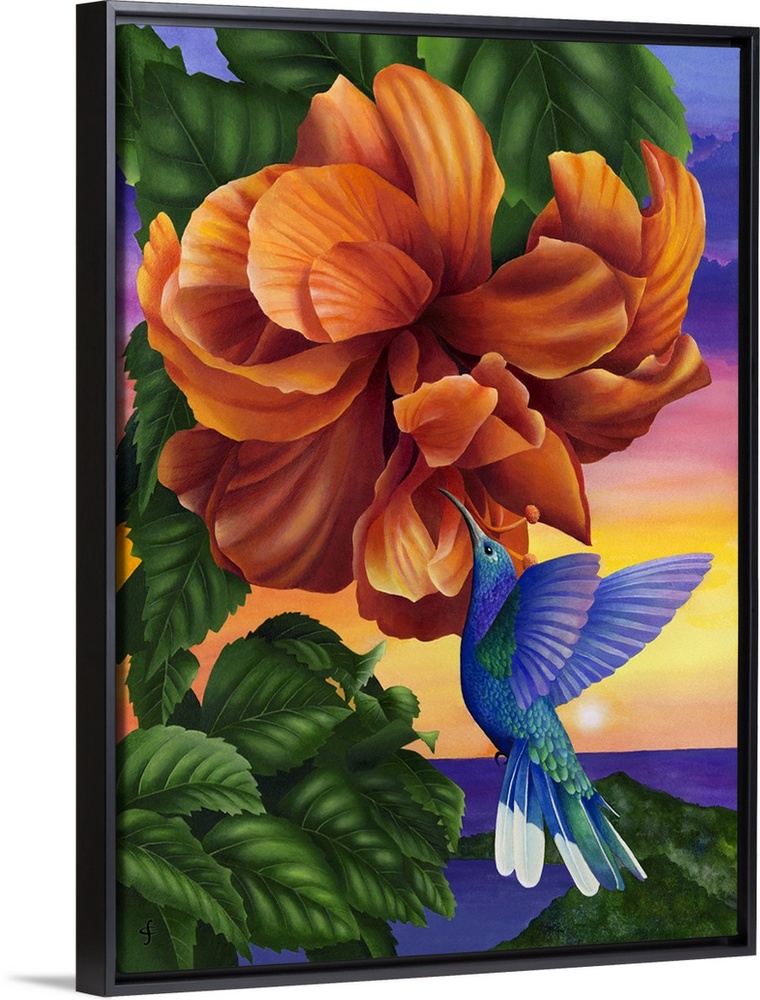 Art Contemporary Art Plants and Flowers Wildlife Florals Tropical Flowers Orange Wall Art Painting Carolyn Steele Watercolor Wildlife Bird Hummingbird Tropical Birds