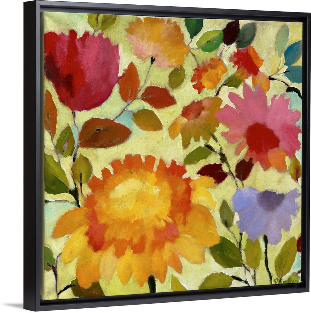 <p>A series of flowers and leaves in warm colors and a soft style against a pale yellow background.</p>