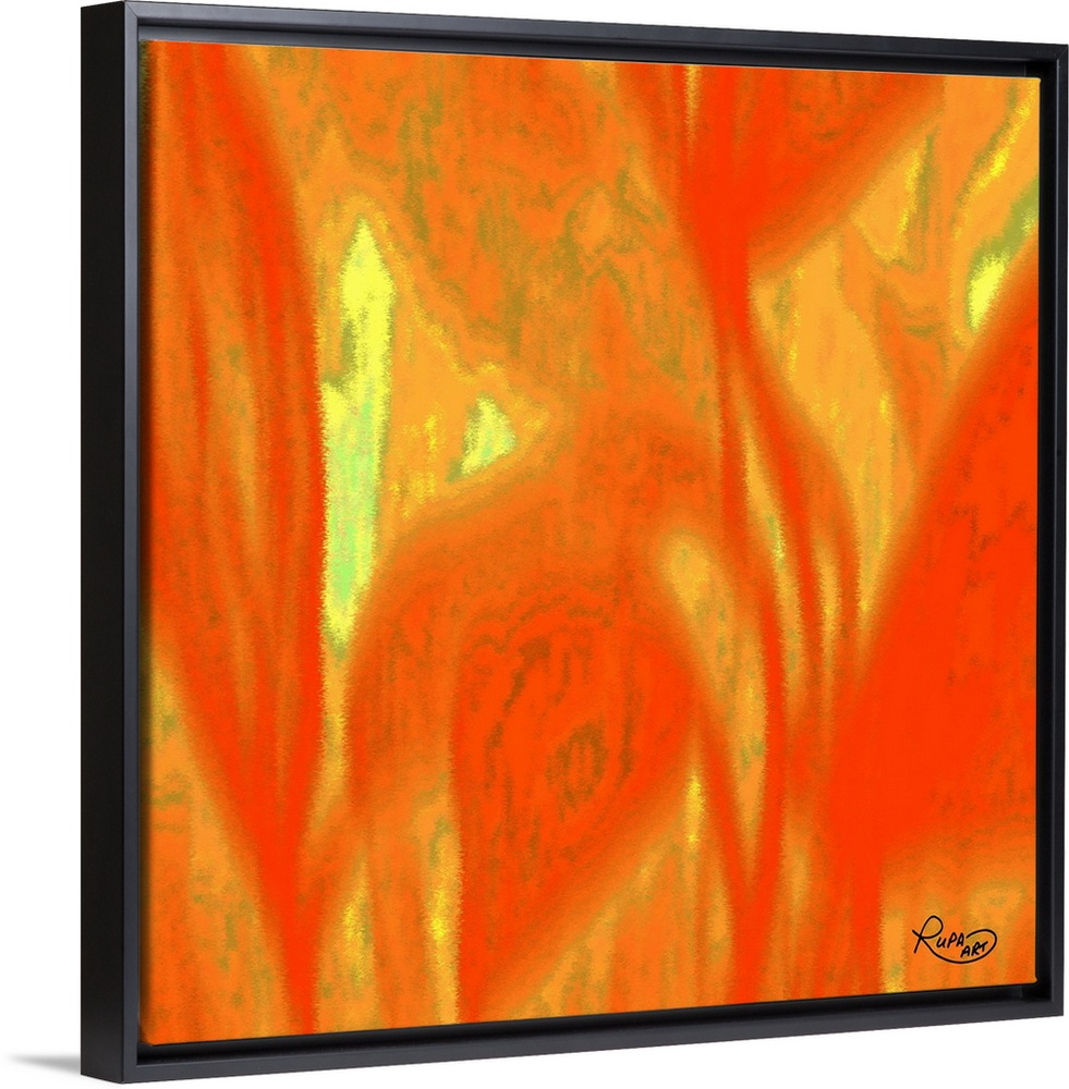 <p>Square abstract art with a bright orange background and large faded yellow designs.</p>